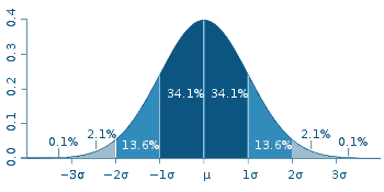 首先离差智商是一个相对的量,表示一个人在智商测试中所获成绩偏离同年龄组平均成绩多少的量化值,它将同年龄组所有人的得分看作正态分布,如下图深蓝区域就是距平均值小于一个标准差之内的数值范围,在正态分布中,此范围所占比率为全部数值约 68%;两个标准差之内(深蓝与蓝)的比率合起来约为 95%。